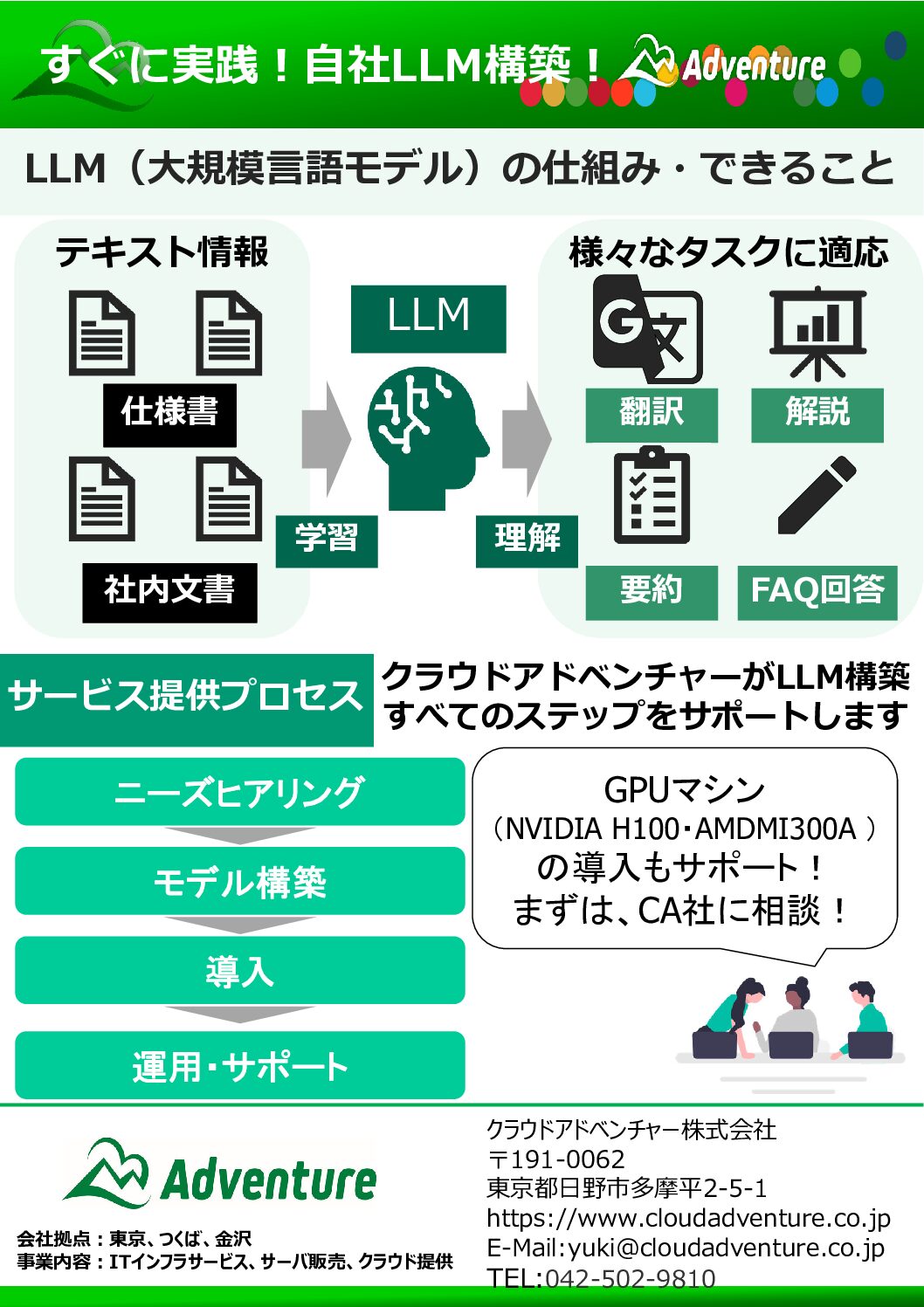 クラウドアドベンチャー(CA)ではお客様に最適なITインフラを提供いたします。クラウドかオンプレミスか、データのバックアップ、システムのバックアップ、どうやったら効率よく使えるか?見えない費用の消費電力の削減はどうするか?などなど。大手企業様から中小企業様まで、ぜひお気軽にご相談ください。ちなみにほぼ全員通訳案内士の資格を有しており、訪日外国人の多摩、高尾の案内が得意です。